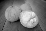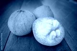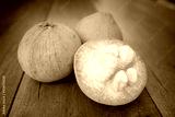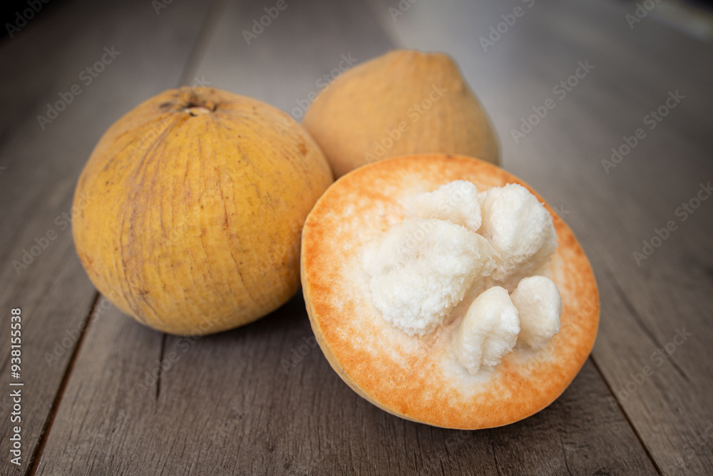 Half of ripe santol fruit or cotton fruit , is a tropical fruit native to maritime Southeast Asia on wooden table.