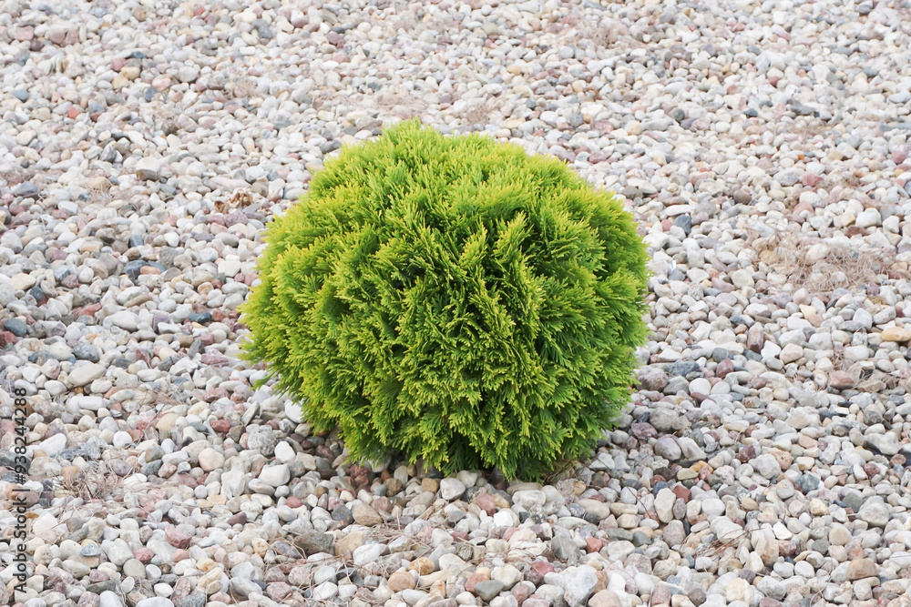 Single western thuja surrounded by decorative stones in a garden. Beautiful home decoration that adds a touch of greenery and elegance to outdoor spaces.