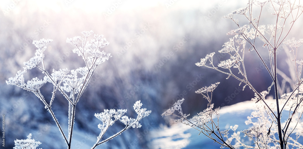 Frost-covered dry branches of plants in winter on a sunny morning
