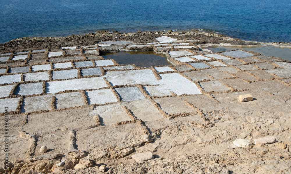 View from above of a historic salt works on Gozo in Malta. The salt works is located on the coast of the sea. There is dry salt in some of the square fields.
