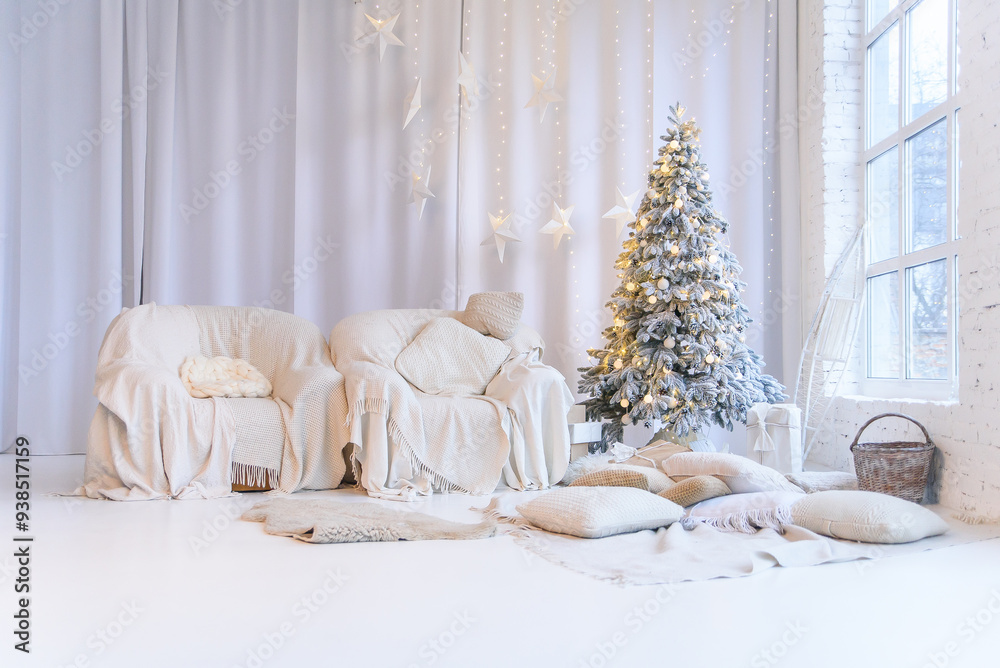 White interior with Christmas tree with artificial snow and garlands and New Year's gifts.