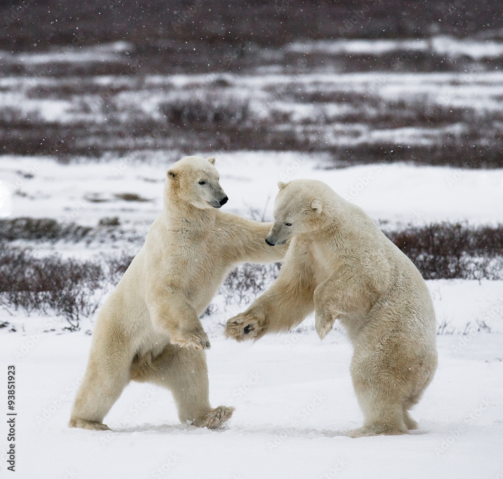 Two polar bears playing with each other in the tundra. Canada. An excellent illustration.