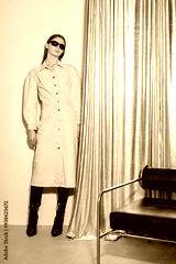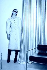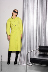 High fashion portrait of young woman in lemon long dress. Sunglasses,
