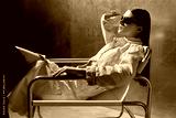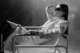High fashion portrait of young woman in lemon long dress. Sunglasses,