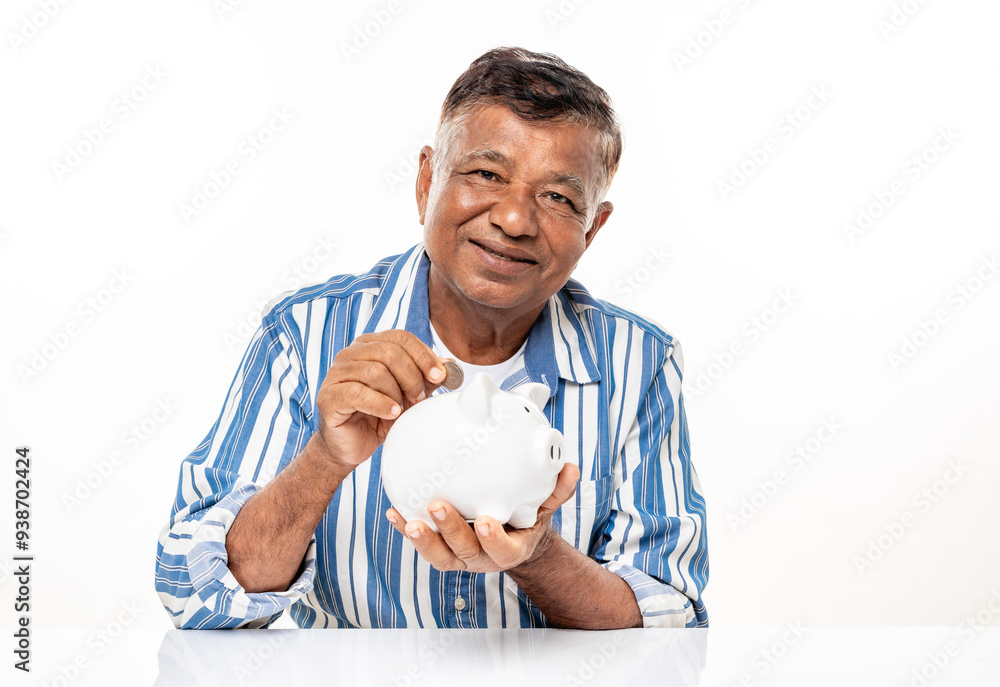 Elderly man putting money coin into piggy isolated on white background, investment financial concept.