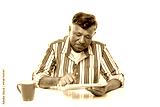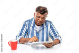Elderly Asian man using tablet computer and drinking coffee isolated on white background.