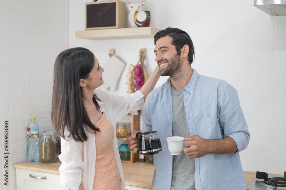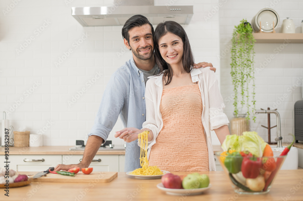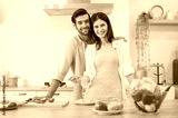 Happy young couple cooking together in the kitchen at home