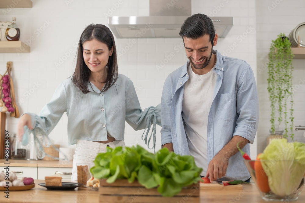 Happy couple preparing food at home, young couple cutting vegetables together at kitchen counter