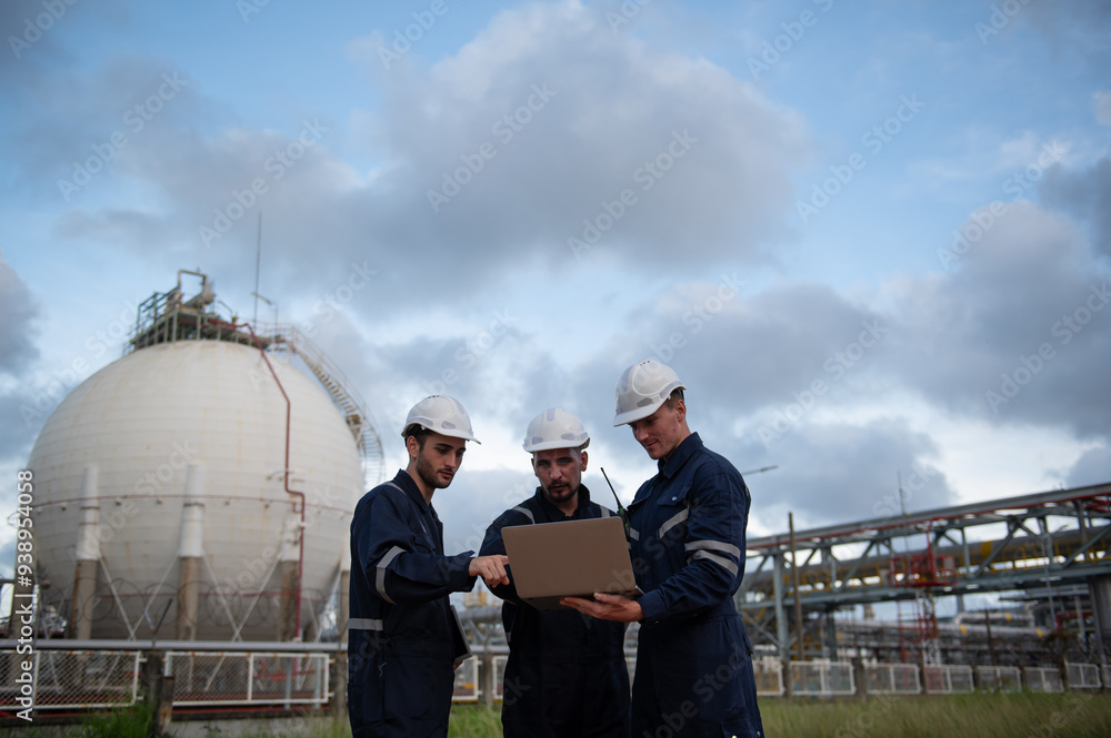 Refinery industry, engineer working on computer laptop at oil and gas refinery plant industry factory