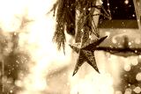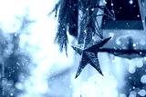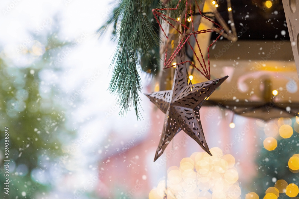 Beautiful festive decorations on the Christmas tree. Close-up. Beautiful Christmas background. The concept of decorations and decor for the new year. New Year's Card 2025