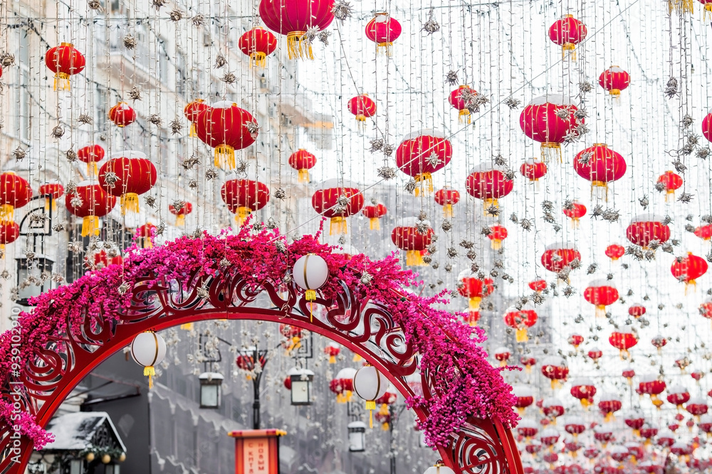 Chinese red Christmas lanterns on Tverskaya Street in Moscow. Close-up. The first ever meeting of the Chinese New Year 2024 in Moscow.