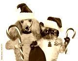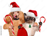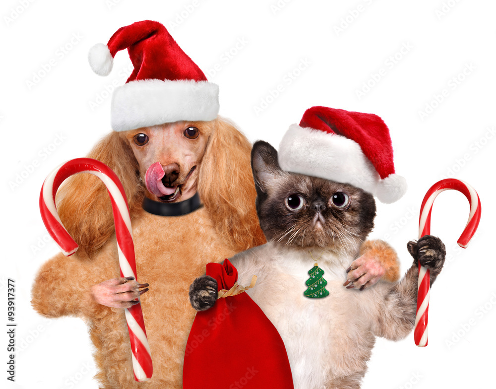 Cat and dog in red hat holds a Christmas candy. Isolated on white.