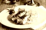 white fish with pesto sauce and meat plate in a still life