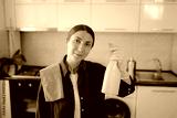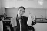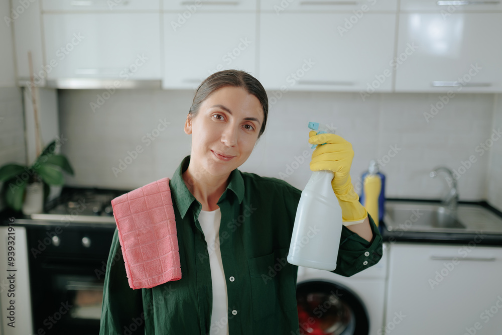 Cheerful Young Woman in Yellow Gloves in Her Kitchen, Posing for the Camera