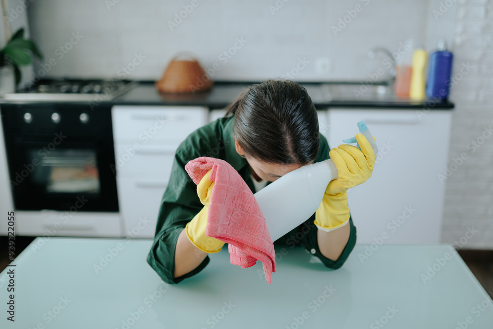 Exhausted Maid Sitting at Kitchen Table, Overwhelmed by Fatigue