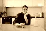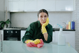 Weary Housewife Taking a Break at Kitchen Table, Yellow Gloves