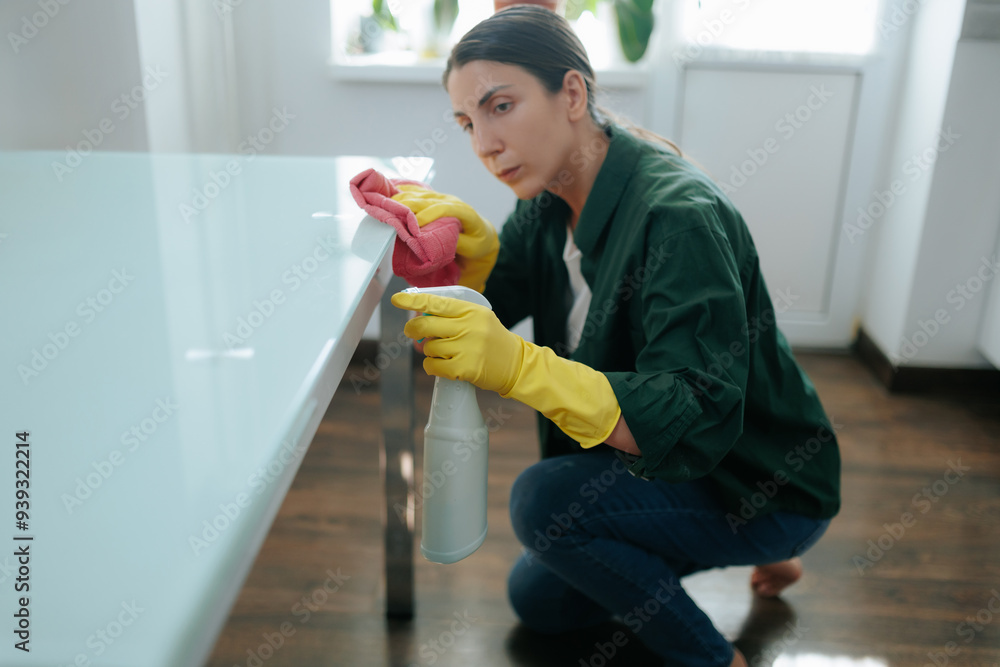 Housewife Washing Table, Yellow Gloves On, In Modern Kitchen