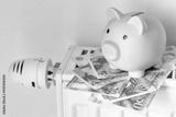 British pounds lying on an unscrewed radiator and a piggy bank, Concept, financial budgeting. Winter heating costs in the UK