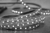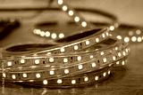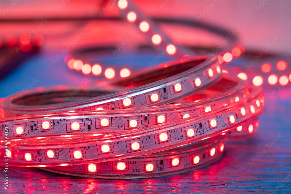 Close-up of red LED diode strip, blurred background.