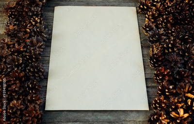 Blank Paper Sheet on Rustic Wooden Background with Pine Cones – Natural Christmas Mockup Template