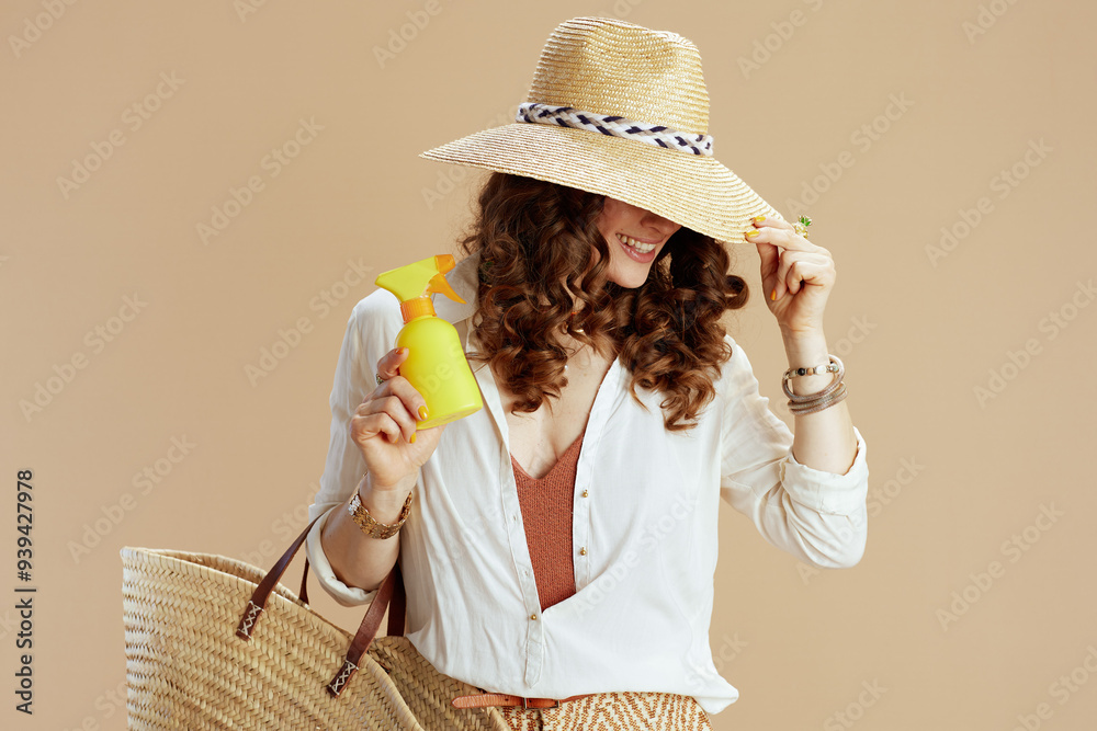 happy housewife in blouse and shorts against beige