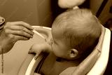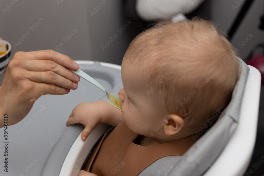 Dorosły karmiący niemowlę pomarańczową papką w krzesełku. Podkreśla troskę i uważność rodziców podczas karmienia. Scena buduje poczucie bezpieczeństwa i normalności w procesie żywienia dziecka.