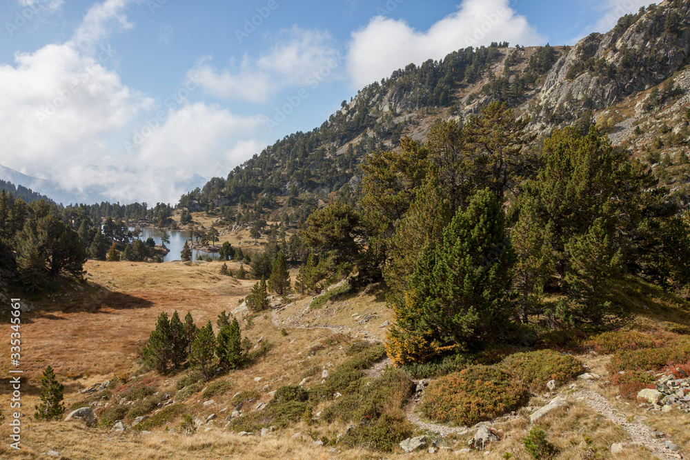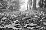 Dried oak leaves on a trail in the forest. Sunlight at the end of the trail. Perspective view from ground level with blurred background.