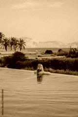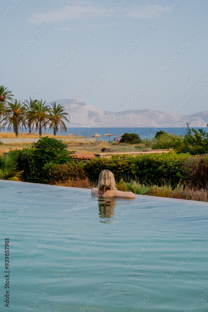 Blonde girl swimming in infinity pool in Greece looking at sea while enjoy relaxing swim
