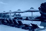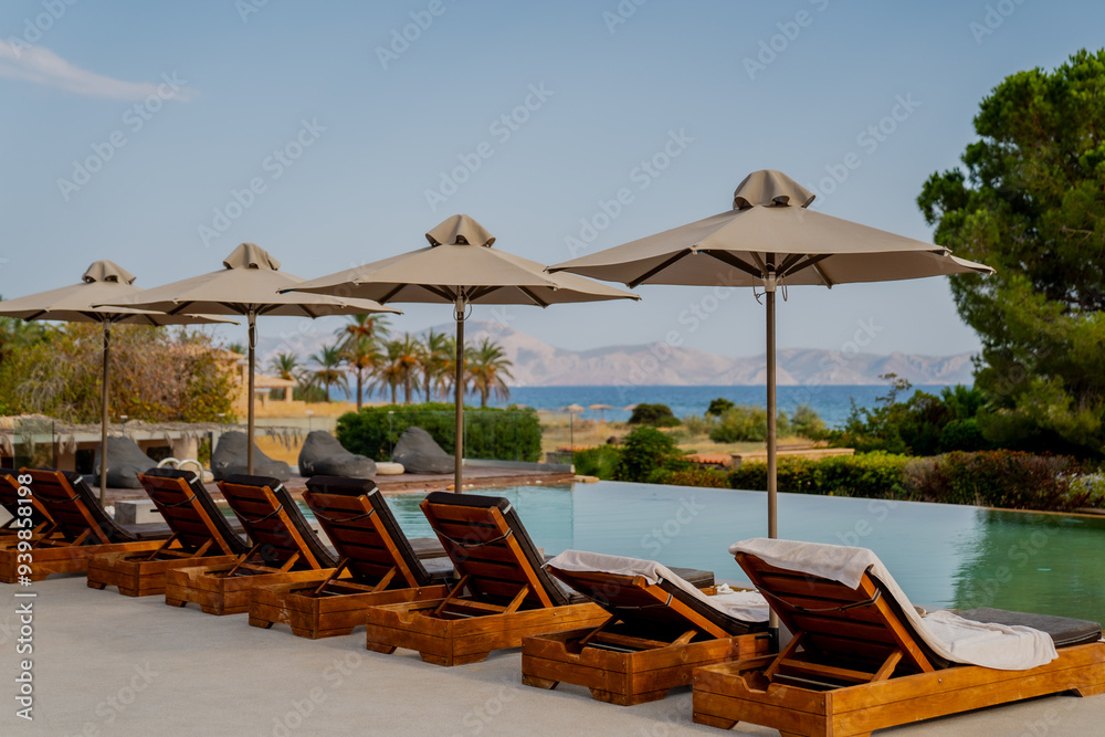 Sun bathing beds and sun umbrellas next to a infinity pool in Greece