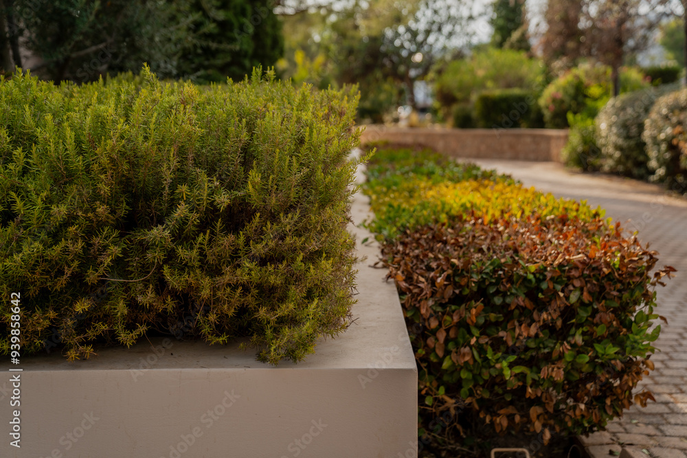 Trimmed landscaped bush in garden next to pathway in property in Greece