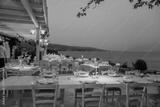 Nice greek style restaurant dining tables next to the Saronic islands in Greece and mountains in the background. No people and ready tables in the evening of the coast restaurant