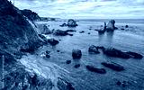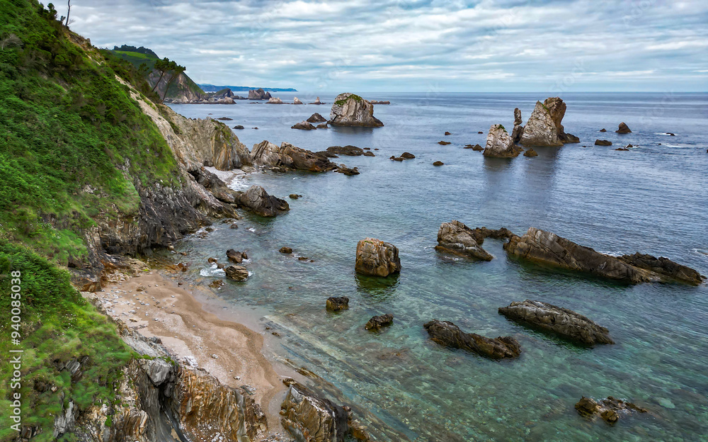 Rocky coastal landscape with clear turquoise water, steep green cliffs, and scattered large rock formations in the calm sea