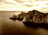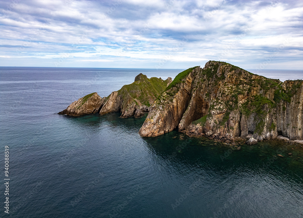 Aerial view of rugged coastal cliffs with green tops surrounded by calm blue waters under a cloudy sky