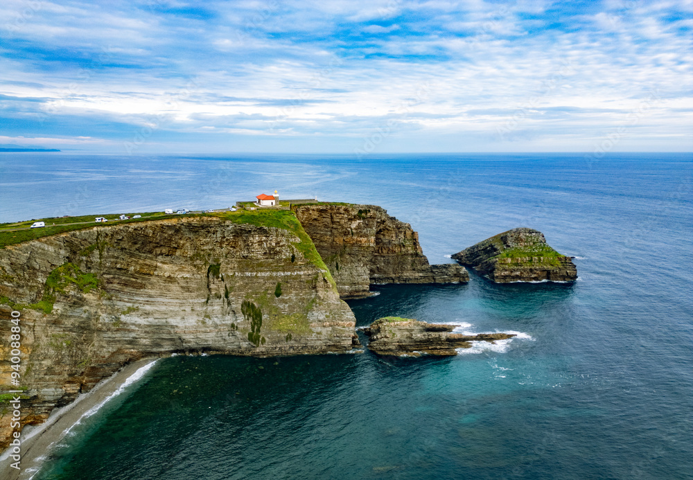 Aerial view of a lighthouse on top of towering cliffs surrounded by the blue ocean and rocky islets under a cloudy sky