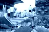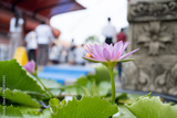 Pink lotus blooming and many lotus green leaf in pound with blurred background, side view and horizontal.