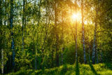 Grove of birches with young green leaves at sunset or sunrise in spring or summer.