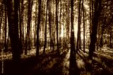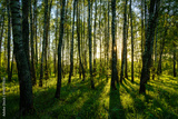 Grove of birches with young green leaves at sunset or sunrise in spring or summer.