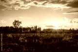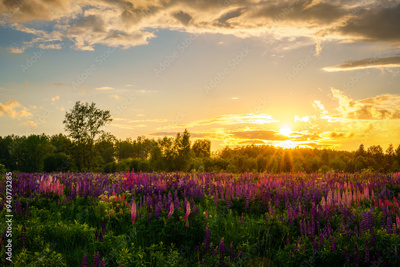 Sunrise or sunset on a field with purple lupines on a cloudy sky background in summer.