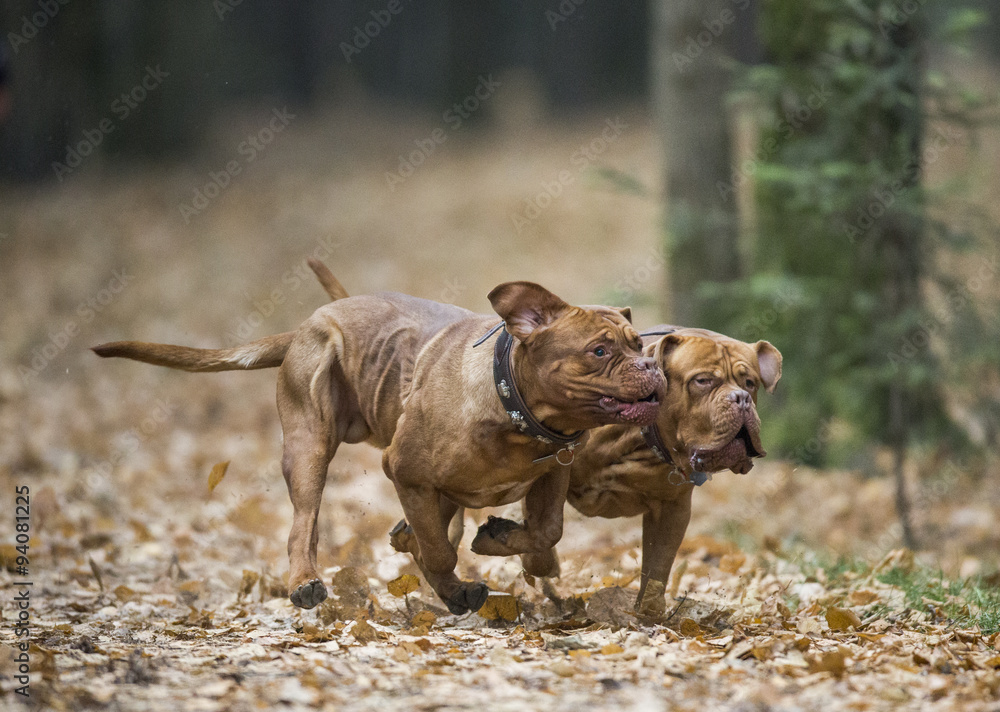 Two Bordeaux dog playing in the autumn park. An excellent illustration.