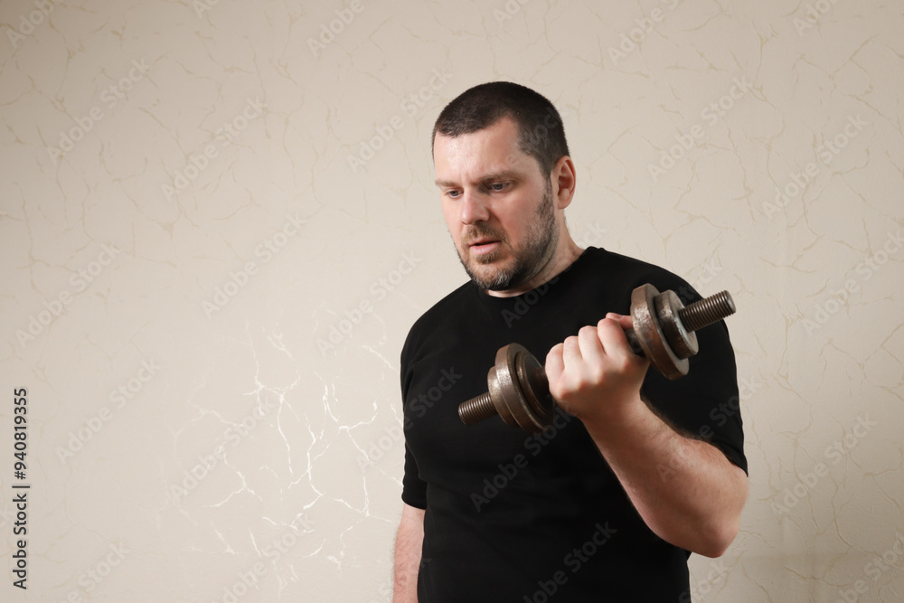 Man exercising in home gym, lifting weights to enhance muscle strength, staying fit and muscular through regular exercise.