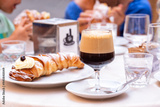 Italian breakfast table in a cafe. Eating. Caffè shakerato in a tall glass. Cold shaked coffee with a foam made with ice. A sfogliatella or lobster tail or coda d'aragosta, shell-shaped filled pastry