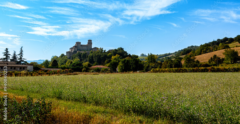 Italian landscape, meadow, hills, forest and the Torrechiara castle, Parma regione.