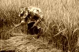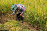 Thai farmer while harvesting rice paddy in rice field. Agriculture is a key economic driver in Thailand.