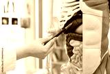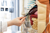 Medical professional pointing at human anatomical model in bright educational environment. Model illustrates internal organs, bones, and tissues for in-depth study and training.