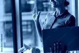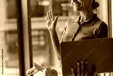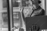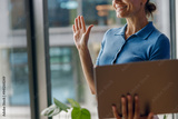 A woman dressed in a blue polo shirt enthusiastically waves while holding a laptop, preparing for a virtual meeting