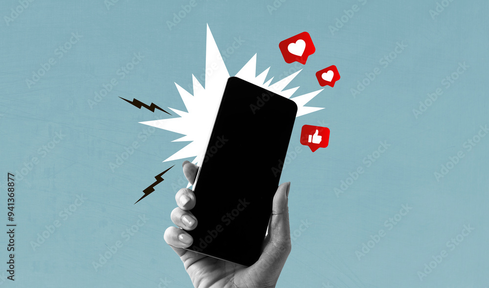 Hand holds pointing to like symbols of social networks from mobile phone with black screen. Art collage digital pop modern art.