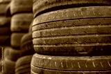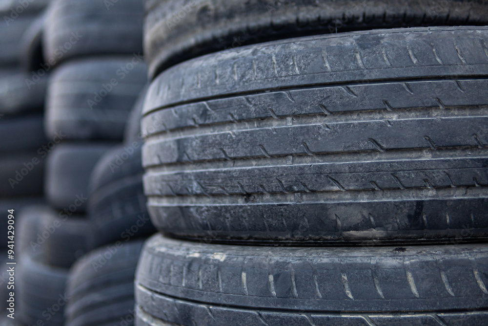A pile of old tires stacked on top of each other. The tires are black and appear to be worn out. Concept of neglect and abandonment, as the tires are piled up and not being used.
