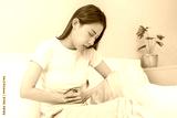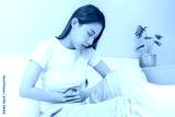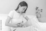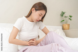 Flatulence ulcer, asian young woman, girl hands in belly, stomach pain from food poisoning, abdominal pain and digestive problem, gastritis or diarrhoea. Abdomen inflammation, menstrual period people.