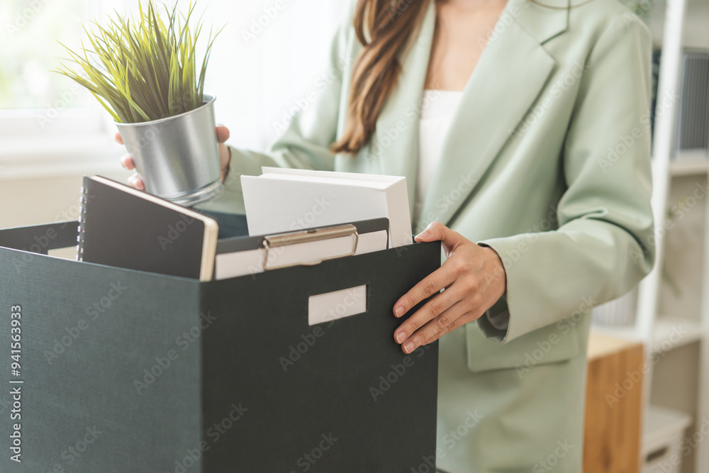 Unemployed, quite job. Desperate asian young businesswoman resigning from company, hand holding cardboard, packing belongings, stuff into box, layoff or changing work. Resignation, employment concept.