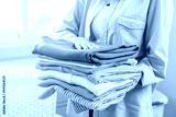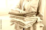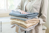 Feel softness, chore of asian young woman, girl housewife hand holding pile clothing from table, stack folding clean clothes after washing, laundry and dry, working at home. Laundry maid in household.